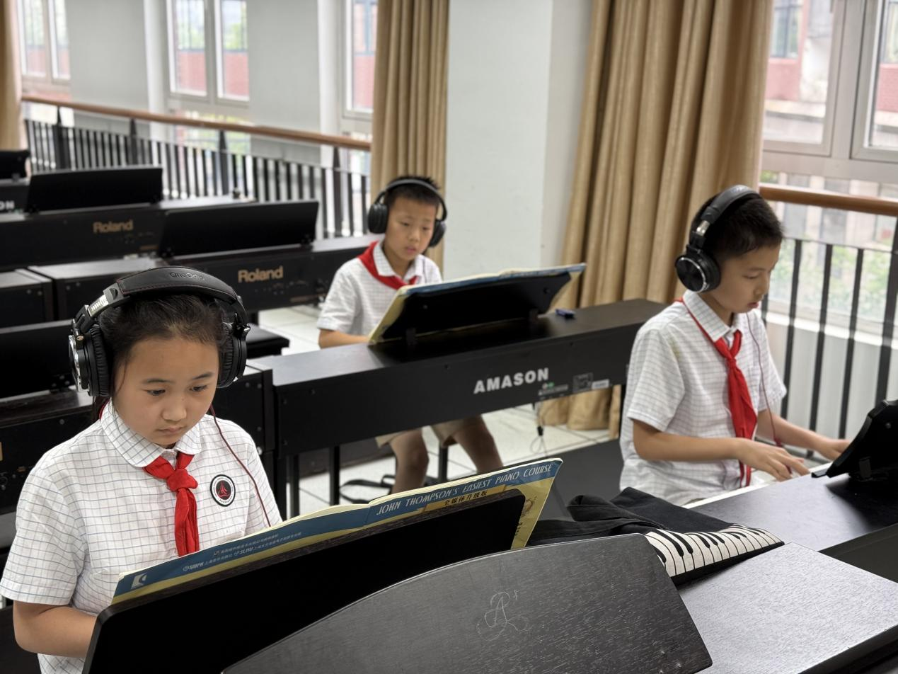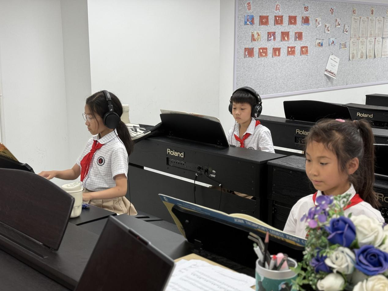 社团课程采用"基础+趣味"的教学模式。前半小时进行基本功训练,包括手型矫正、音阶练习和简单的哈农指法;后半小时则学习《小汤普森》《英皇》等教材中的经典曲目。为了让孩子们更好地理解音乐,老师还创新性地将乐理知识编成小游戏,比如用彩色卡片认识音符,通过节奏拍手游戏培养乐感。